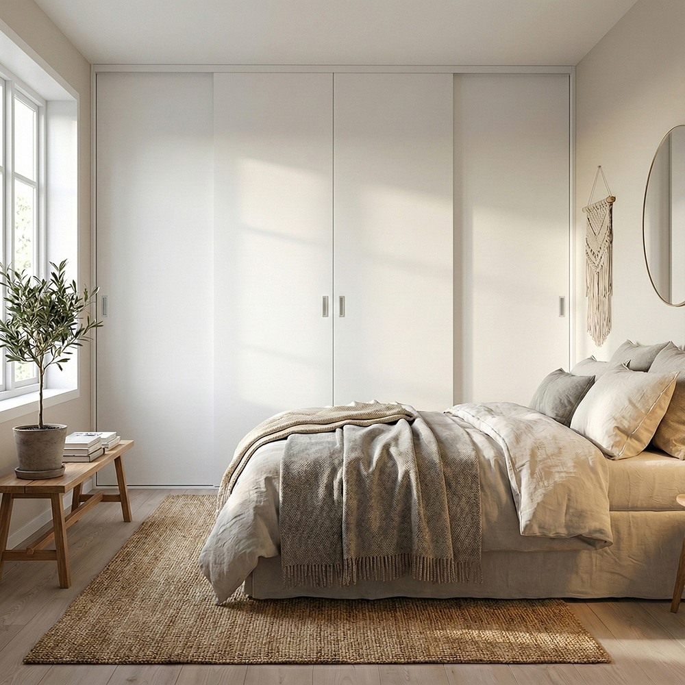 4 skjutdörrar från bredd 197 - 801 cm. I priset ingår skena och beslagslåda.